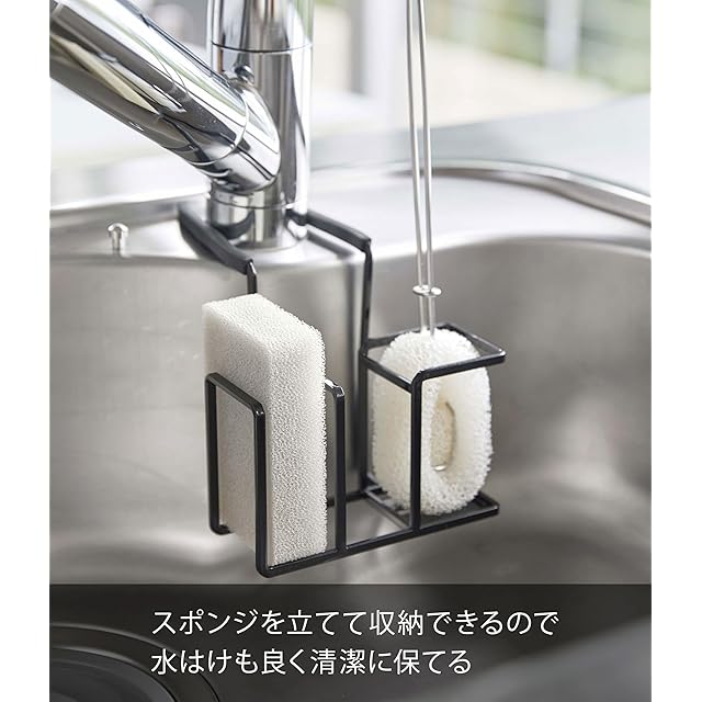 山崎実業(Yamazaki) 蛇口にかけるスポンジ&ブラシホルダー ブラック 約W14XD17.5XH13cm タワー スポンジ置き ラック ブラシスタンド 5081