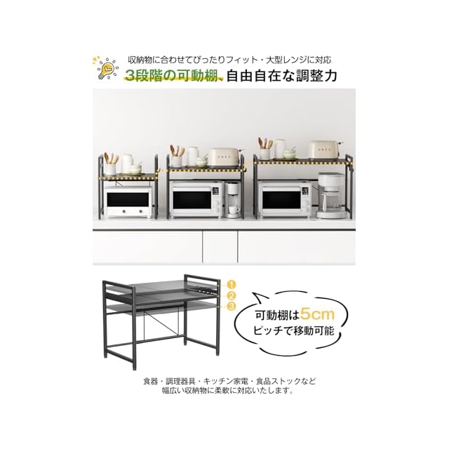 【耐荷重能力が強い】伸縮式ラックの耐荷重は約15-50Kgで、幅により異なります。最小幅39㎝の場合、耐荷重は約50Kg、最大幅65㎝の場合、約15Kgです。トースターや、ポット、コーヒーメーカーなど普通の小電気製品や鍋も棚板の上に置いて、棚板の変形や壊れ等の心配なくて安定です。安心にご使用できます。