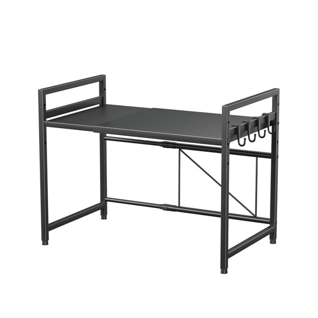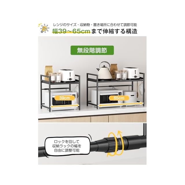 TKUIN レンジ上ラック キッチン 伸縮式 トースターラック 幅(39-65cm) 伸縮可 オーブンレンジ 棚板高さ調節可 電子レンジ台 収納 耐荷重50kg フック4つ付き 組み立て簡単 おしゃれ (ブラック)