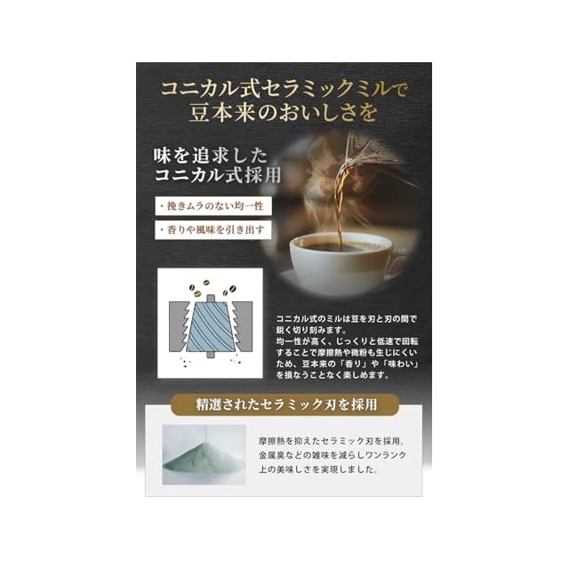 ✅【珈琲バリスタ監修/味を追求したコニカル式採用】豆本来の「香り」や「味わい」を損なわないコニカル式を採用。バリスタ監修によるセラミックミルを使用することで、金属臭などの雑味を防ぎ、ワンランク上のおいしさを実現しました。