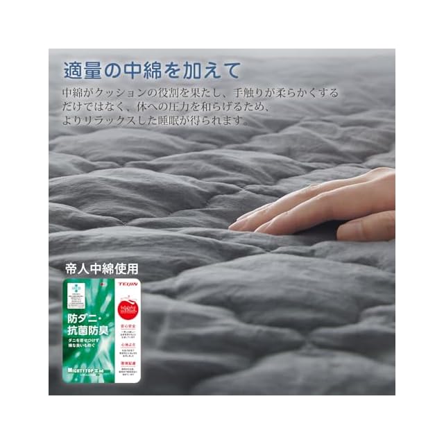 「通気性と速乾性」:通気性が高いため、シーツの中で湿気がこもりにくく、快適な寝心地を提供してくれます。また、このシーツは中綿が入っているにも関わらず、速乾性に優れています。洗濯後に素早く乾くため、いつも清潔な寝場所を保ちます。