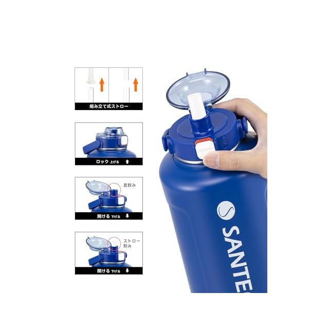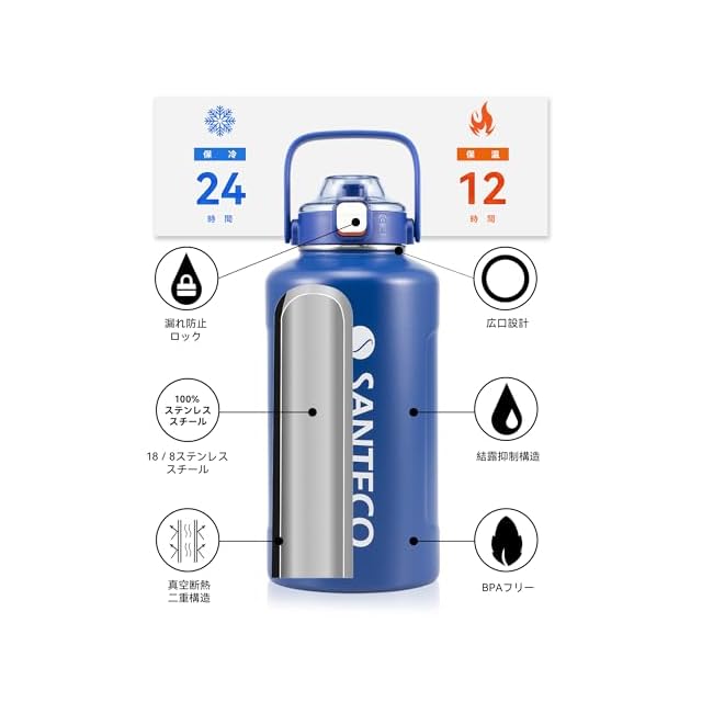 SANTECO 水筒 保温保冷 大容量 魔法瓶 1900ML ストロー付き 直飲み 水筒 ステンレス 真空断熱 ブルー