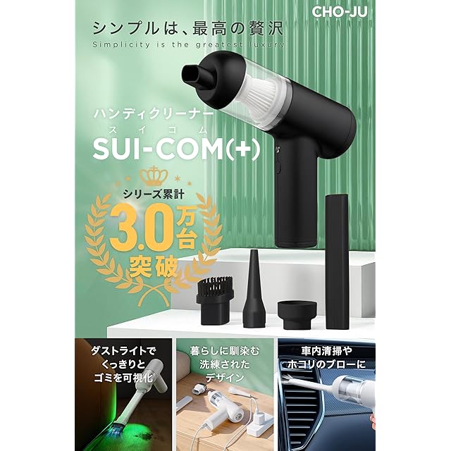 【雑誌掲載×3万台販売】 ハンディクリーナー ハンディ コードレス 小型掃除機 車用掃除機 多機能 4in1 【ブロー/吸引/空気入れ/空気抜き】シンプルデザイン Type-C充電式 布団圧縮 アウトドア CHO-JU SUI-COM(+) スイコムプラス ブラック