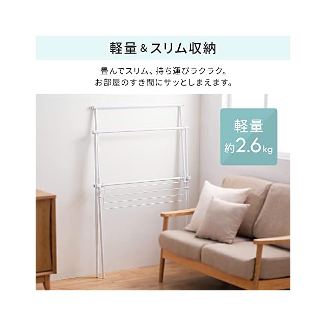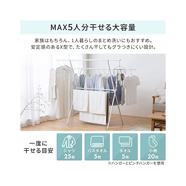 一度に干せる目安(タオルハンガー使用時)/シャツ等25枚、バスタオル5枚、タオル5枚、小物20枚 ※ハンガーとピンチハンガーを使用