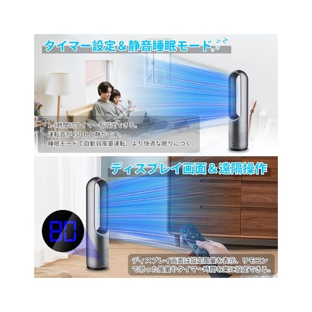 【左右自動首振り・9時間タイマー・リモコン操作】 羽根なし 扇風機 は左右100°に自動首振り機能でより広範囲に送風できるので、8-15畳の部屋に対応します。自分のニーズに合わせて1-9時間タイマー「切」設定可能となり、出勤時や夜間の就寝時、勉強時に最適です。また、羽根無し扇風機 を8m以内で自由に遠隔操作できて、ベッドやソファーから離れる必要はありません。暑い季節に涼しさはすばやく部屋の隅々まで充満させ、気持ちよい室内環境を作ります。
