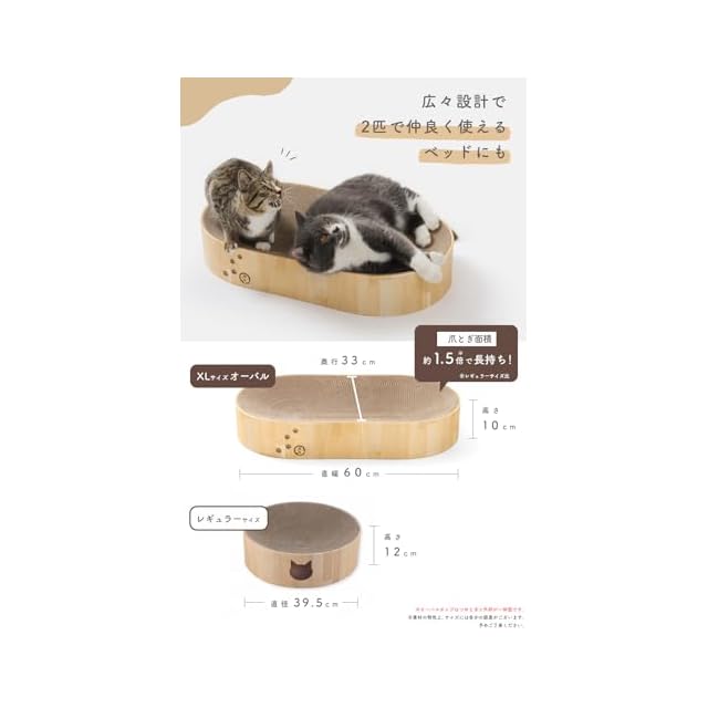 【大人気バリバリボウルが”横長”に】からだフィット形状のつめとぎベッドとして、猫から大人気のバリバリボウルの “オーバル”タイプです。つめとぎベッドはレギュラーサイズ比、約1.5倍でたっぷりつめとぎを楽しめます。