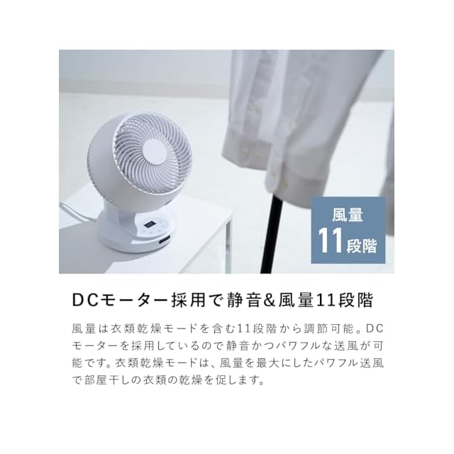 風量は衣類乾燥モードを含む11段階から調節可能。衣類乾燥モードは、パワフルな送風で部屋干しの衣類の乾燥を促します。
