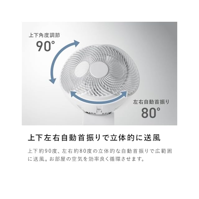 上下約90度、左右約80度の立体的な自動首振りで広範囲に送風。お部屋の空気を効率良く循環させます。