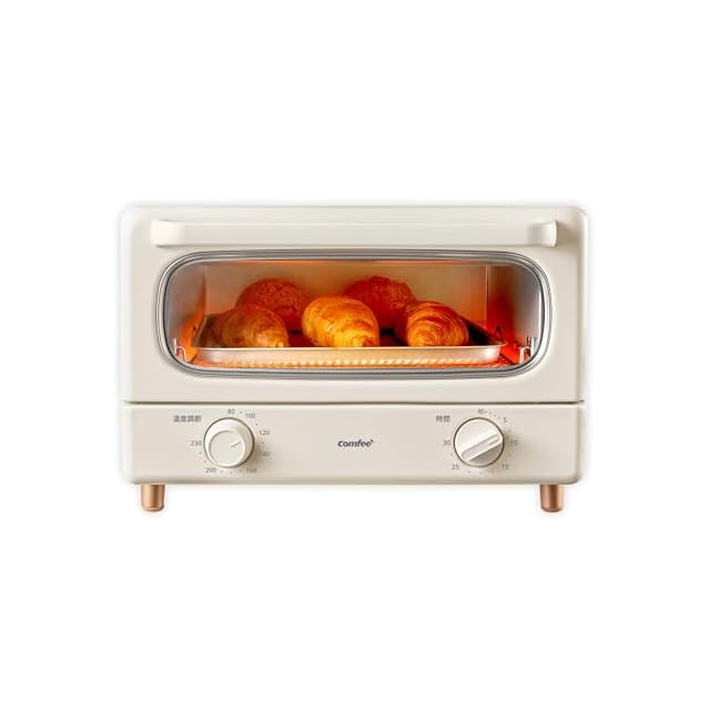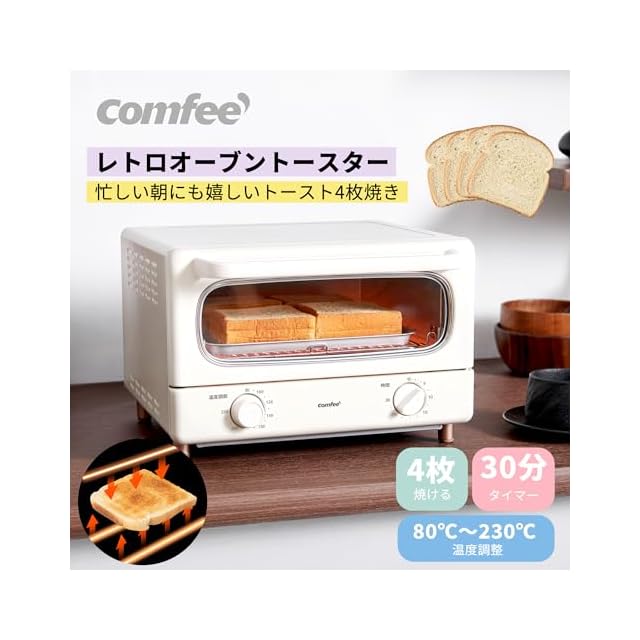 【商品仕様】COMFEE' レトロオーブントースター:◇外形寸法:幅34.6*奥行36.6*高さ23.5cm、約4.4kg ◇庫内寸法:幅27.7*奥行28*高さ19.6cm◇容量:トースト4枚焼き(25㎝ピサ) ◇電源:AC100V ◇最大出力:1300W ◇タイマー:最大30分 ◇ヒーター:3本 ◇温度範囲:80-230℃◇付属品:パンくずトレイ*1・日本語取扱説明書◇設置:散熱のため、上は10㎝、周囲は4.5㎝の隙間を開けてください※ 製品期間:一年間