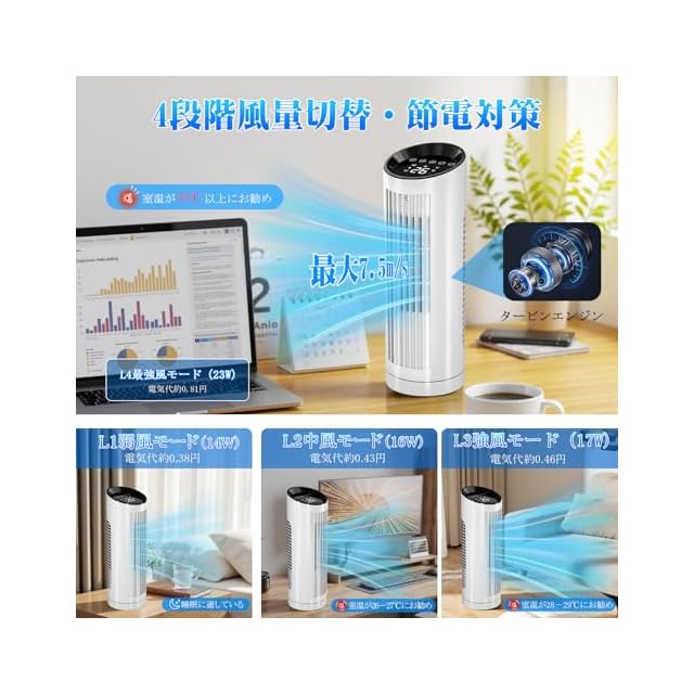 【 パワフル送風・タービンエンジン・羽根無し 】 ハイパワーDCモーターを搭載したタワーファンは、静か・省エネルギーで運転だけでなく、やさしい風からビューンと遠くに届く強風まで幅広い風速を実現、最大風速は7.5m/s!また、タービンエンジンも採用し、強力なターボエアフローを生成して空気循環を加速します。タワー扇風機は広範囲に風を届け、非常にパワフルな送風性能で、耐久性もUP!通気口は狭い格子を採用し、羽根なしの扇風機で、お子様やペットのいるご家庭におすすめ!