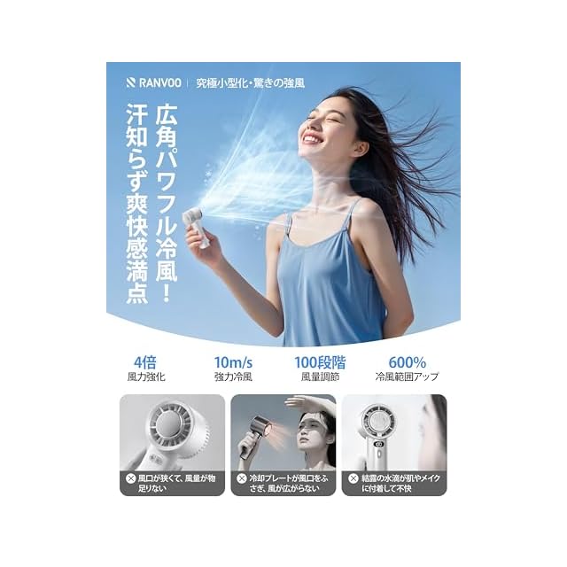 【驚くべき涼しさ!10m/sの強風で瞬時にクールダウン】RANVOO手持ち扇風機は、最大10m/sのパワフルな風量と、100段階の細かな風量調節を搭載。シーンに合わせて最適な風を選べるので、心地よい涼しさを自由にコントロールできます。ハンディ扇風機として、電車や混雑した街中でも自分だけの快適空間を作り出し、冷風を提供します。コンパクトで持ち運びやすいミニ扇風機として、外出先でもすぐにクールダウンできるため、夏の暑さ対策に最適です。