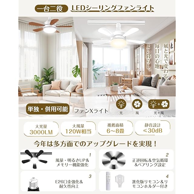 【全年用サーキュレーター・光&風一体化】TENKOO&YOUの大人気シーリングファンライトが今夏、日本に登場!小型でありながら光・風・空気循環の3つの機能を一台で実現。1台で年間を通じて便利に使える万能設計です。2025年アップグレードモデルで、風量と到達距離を向上させつつ、優しい風と静音性を実現。旧モデルより風量と明るさを大幅に強化し、正逆回転、メモリー機能、ペアリング設定など新機能を追加。夏は涼しい風を届ける扇風機として、春や梅雨時には換気や衣類乾燥、空気循環に大活躍。ライトだけ作動、ファンだけ作動、ファン・ライトを同時に作動3段階調整、一台三役を実現!