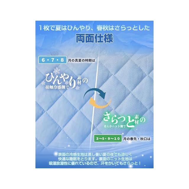 【リバーシブルなので通年使える】表面はQ-MAX0.46の接触冷感生地、蒸し暑い夏の夜でも涼しく快適な睡眠をとります。裏面のニット生地は、通気性に優れ汗をかいても吸湿放湿!春秋にもベタつかずに使えます。