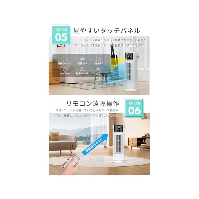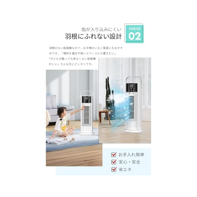 【タッチパネル/リモコン5m遠隔操作・・静音運転】冷風扇風機は操作性が向上した大画面のLEDタッチパネル搭載で、LED液晶画面で設定された機能を一目わかりやすい、高齢者であろうとこどもであろうと簡単にお使いいただけます。最大5mまでリモコン操作できるタワーファンはソファーやベッドに寝転んでも楽に遠距離操作できます。※本体受信部とリモコンの間に障害物がない場合。静音モーターによって、小さな風量は≤40dB、静かな図書館相当です。睡眠や読書、仕事に邪魔にならないので安心にご使用いただけます。また、羽根に触れにくいデザインで、羽根に触れにくいデザインで、運転中の事故やけがの危険性を減らし、お子様やペットの家庭におすすめします。