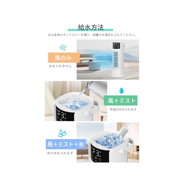 【扇風機より涼しい風!ダブル噴霧口付きさらにcool!】扇風機・加湿器・冷却・空気清浄の機能をこの一台冷風扇に集まれます。工事不要なし、電源を入れてすぐ使えます。水タンクに水と氷を投入し、送風だけではなく、加湿とクールの機能もあり、心地よく涼風を楽しめます。こちらの冷風機にはミスト口が二つ設置され、ミストが通常型の二倍の量となりました。温度を下げると同時に潤くなり、乾燥し暑い環境に暑さ対策として最適です!扇風機より涼しく、クーラーより優しいです。十分な風量を確保しながら加湿効果があり、エアコンの風が苦手な方や、乾燥が気になる方やお子様がいるご家庭におススメです。