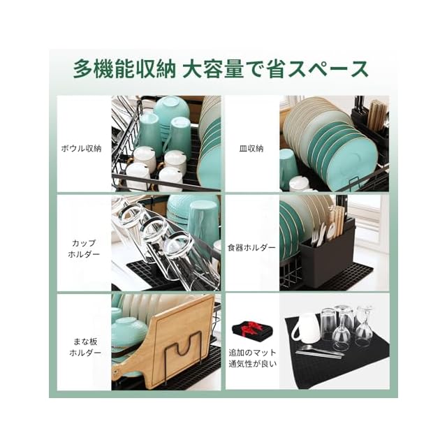 【スペースを節約する】充実的な付属品:ボウルラック*1、まな板ラック*1、包丁と箸セットラック*1、コップラック(最大4つコップを収納可)*1。オプションを組み合わせることによって合理的に並べ、軽量でスペースを節約し、自由度の高い運用を実現します。バスケットは大量の食器類を収納可能で、便利です。