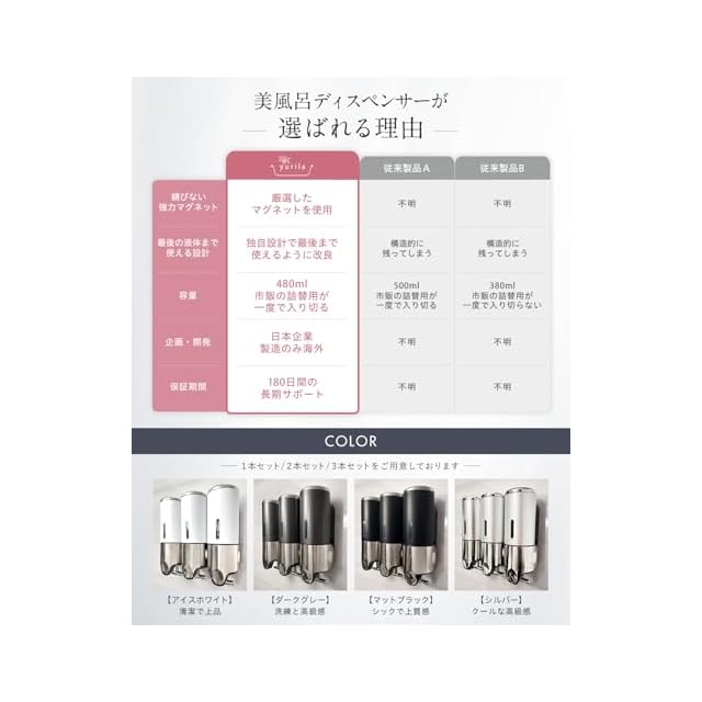【レタスクラブ掲載】 シャンプーディスペンサー マグネット ディスペンサー シャンプーボトル 大容量 強力 おしゃれ 壁掛け 日本企業独自開発 yurila (シルバー, 2本セット)