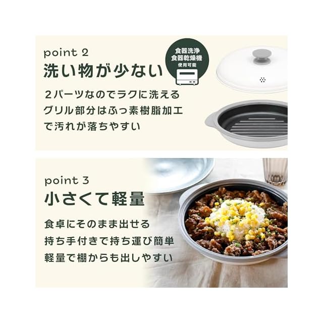 グリル部分は、ふっ素樹脂加工なので汚れが落ちやすく、食器洗浄機対応なのでお手入れも簡単。コンパクトサイズで、食卓にそのまま持ち運びしやすく、軽いので棚からの出し入れも簡単。