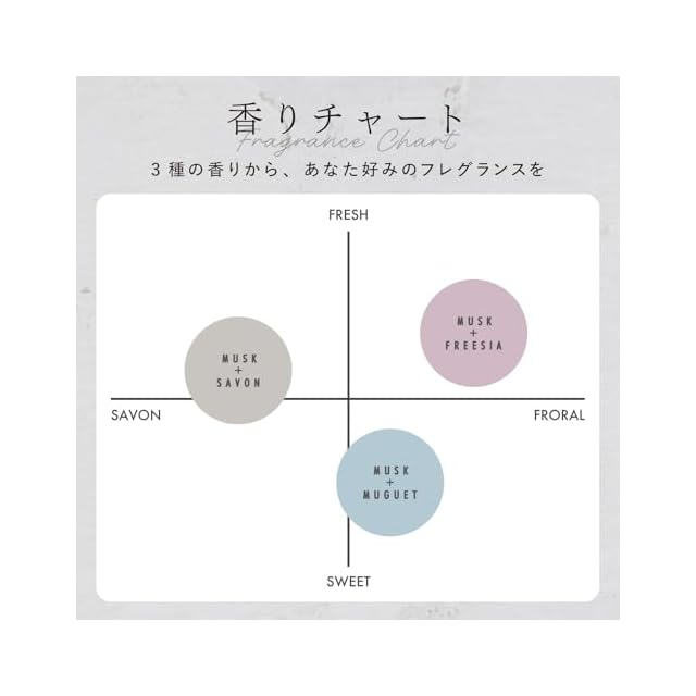 ムスクの優しい香調に、フリージアの落ち着いた上品さをプラスした、奥行きのある華やかな香り
