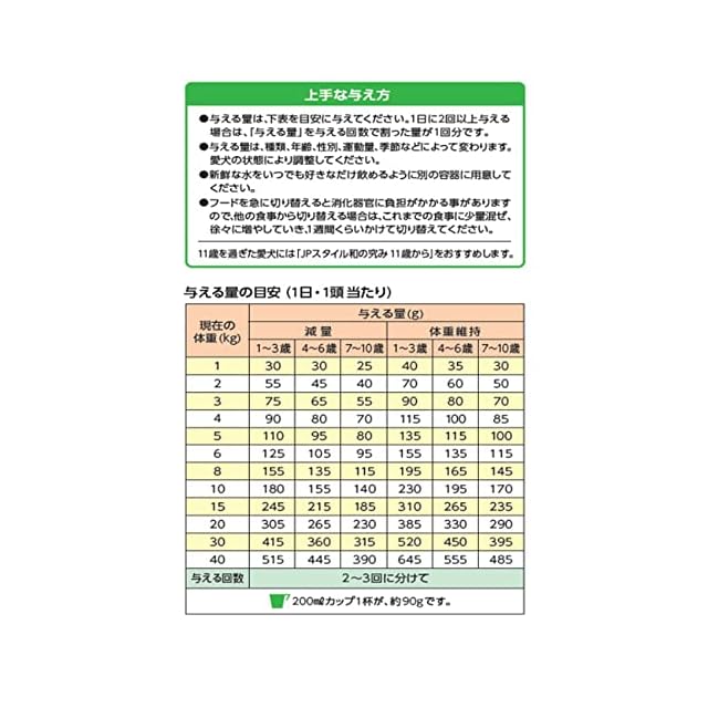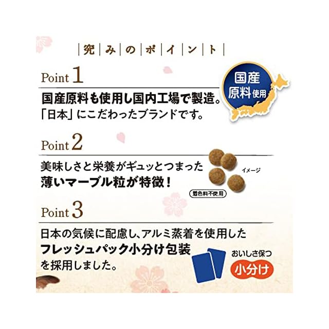 原材料:穀類(小麦全粒粉、米粉、小麦粉、米ぬか、コーングルテンミール、小麦ふすま)、肉類(チキンミール、ミートミール、チキンレバーパウダー)、油脂類(動物性油脂:ビーフオイル、フィッシュオイル:DHA・EPA源)、豆類(おから)、ビートパルプ、糖類(フラクトオリゴ糖)、β-グルカン、セレン酵母、乳酸菌、ビタミン類(A、D3、E、K3、B1、B2、パントテン酸、ナイアシン、B6、葉酸、ビオチン、B12、C、コリン)、ミネラル類(カルシウム、ナトリウム、カリウム、塩素、鉄、コバルト、銅、マンガン、亜鉛アミノ酸複合体、亜鉛、ヨウ素)、酸化防止剤(ローズマリー抽出物、ミックストコフェロール)
