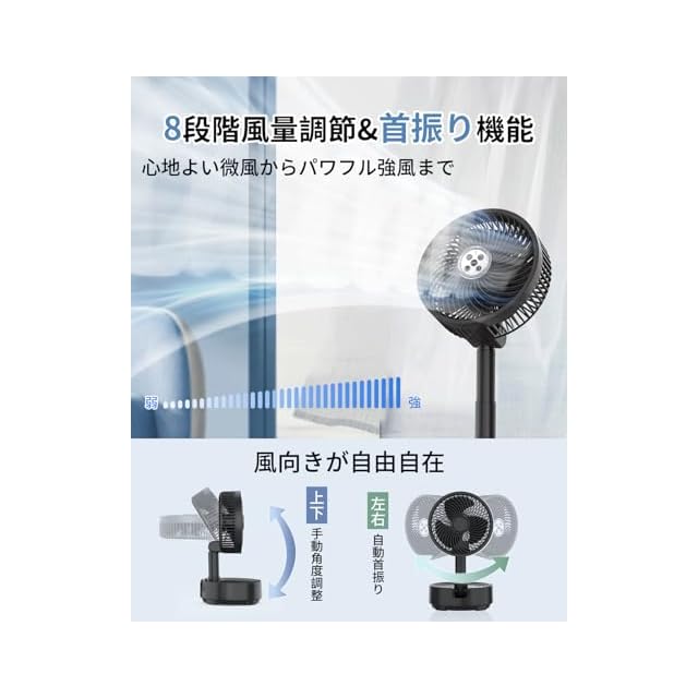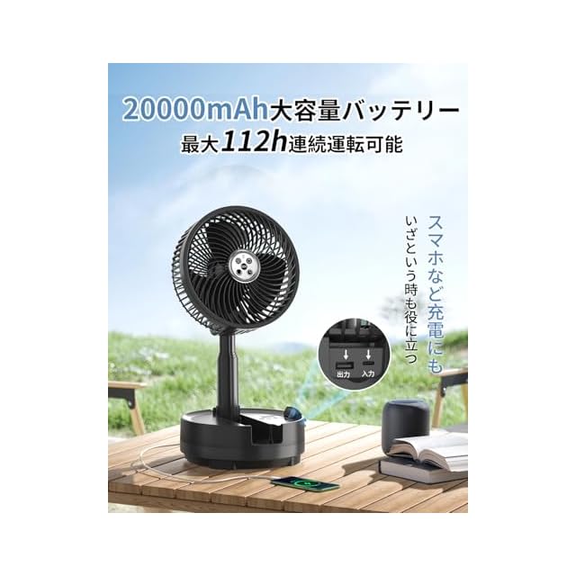 扇風機 折り畳み 20000mAhバッテリー【最大112H連続使用&節電対策】リビング dcモーター 風量8段階調節 卓上扇風機 小型 首振り サーキュレーター 静音 USB充電式扇風機 キャンプ 車内泊 省エネ リモコン付き タイマー機能 LEDライト付き パワフル送風 伸縮式 オールシーズン 暑さ対策 換気/空気循環/部屋干し/衣類乾燥