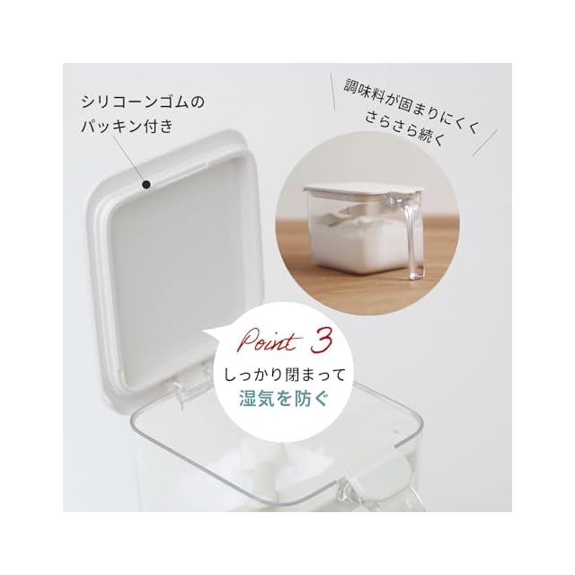 【塩や砂糖が固まりにくい】調味料がかたまりにくい、パッキンがついた調味料ポットです。しっかり閉まって湿気・乾燥を防ぎ、調味料の鮮度を保ちます。毎日使う調味料をたっぷり入れられるワイドタイプの2個セットです。