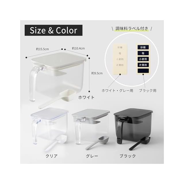 【材質】ケース:スチロール樹脂 フタ・すりきり板・スプーン・ボタン:ABS樹脂 パッキン:シリコーンゴム【サイズ】約600mL(約104×95×155mm)【耐熱温度】ケース:約70℃ フタ・すりきり板・スプーン・ボタン:約80℃ パッキン:約200℃【生産国】中国