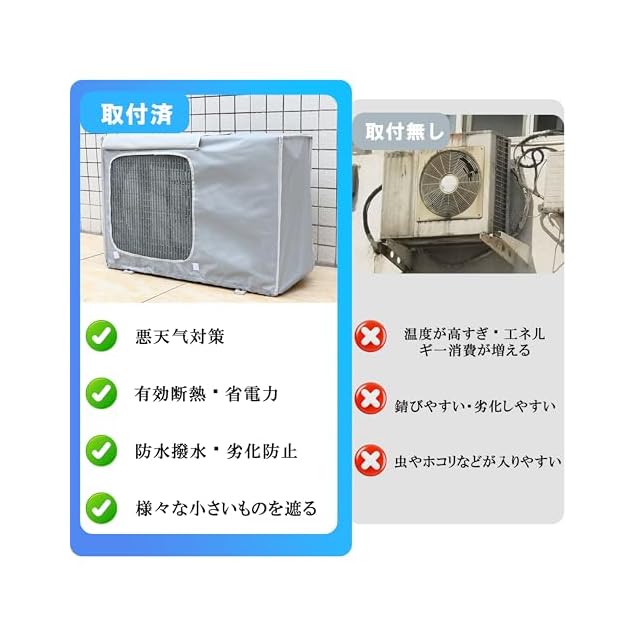 【強い適応性】:伸縮性のあるゴムバンド+結束ロープのデザイン、室外機カバーはさまざまなサイズがあり、さまざまなサイズのエアコン室外機と互換性があり、取り付けが簡単で、安定しており、落ちにくいです。