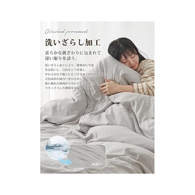 <洗いざらし&超柔らか肌触り>: 洗いざらしとは何度も洗って風合いが自然になったもの。お使いいただく初めから自然な風合いや、やわらかな肌触りを楽しめるように「洗い加工」を施しています。この加工を施した寝具は、洗濯や使用するごとにさらに柔らかくなり、肌馴染みも良くなります。