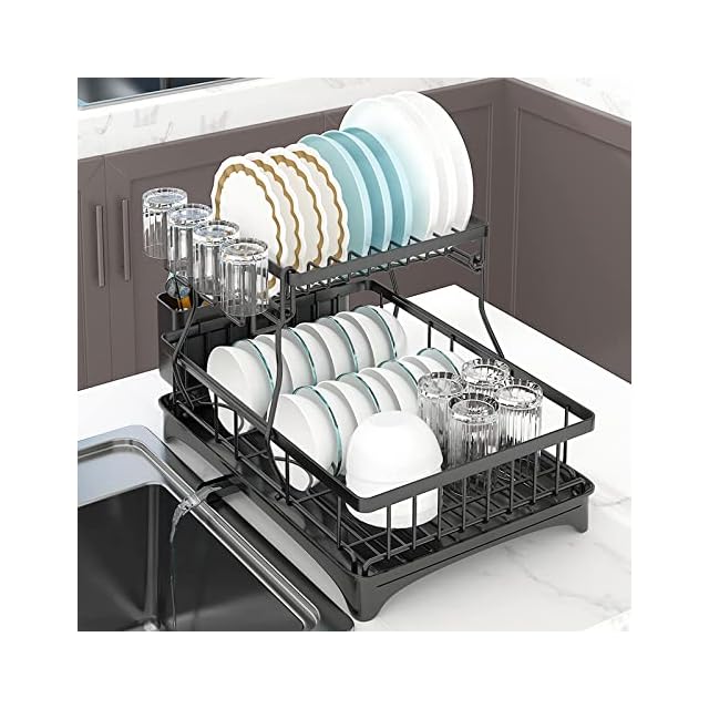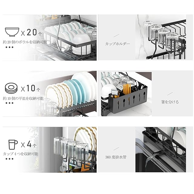 ★【大容量収納&スペース節約】上段では平皿最大10枚、下段ではボウル最大20枚を収納可能です。洗った食器をサッと水切りできて、清潔で乾燥した状態に保ちます。上の段には大きな食器を収納でき、下の段には小さな食器やカトラリーなどを収納することができます。これにより、必要な食器を取り出すときに、探す手間や時間を節約できます。食器を収納することで、キッチンの清潔感や整理整頓感を高めることができます。