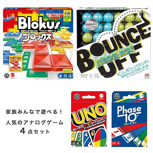 【内容】家族みんなで遊べる人気のアナログゲーム計4点がセットに! ①世界中で大人気のボードゲーム”ブロックス” ②シンプルだけどクセになる!”バウンスオフ” ③カードゲームの大定番”ウノ” ④アメリカで年間100万個以上売れているゲームがついに日本上陸!”フェーズテン” 家族や仲間とみんなでワイワイ楽しもう!