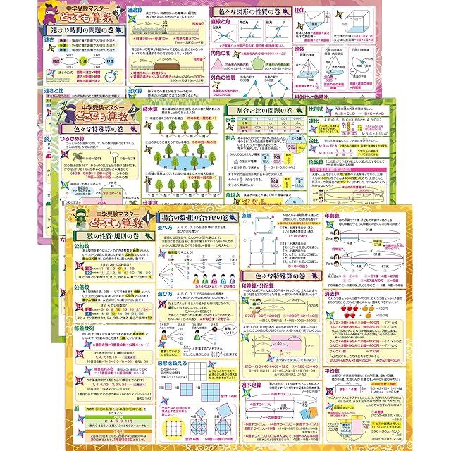 中学受験に必要な算数をコンパクトに凝縮 中学受験に必要な算数の要点を3枚のポスターにまとめ、各単元の復習に最適です。主要な問題形式や公式を分かりやすく整理し、短期間で効果的に学習することができます。