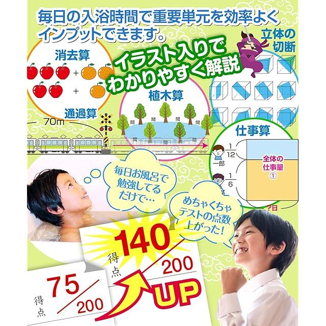 入浴時間を利用した効率的な学習 お風呂の壁に貼って使うことで、入浴中の時間を有効に活用し、中学受験算数の範囲を効率的に学ぶことができます。水で濡らすだけで簡単に貼り付けられ、剥がれにくい耐久性を持っています。