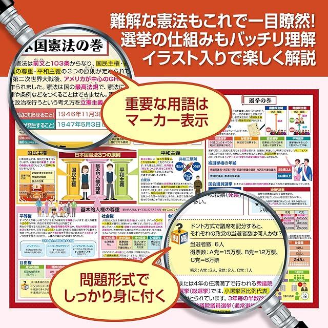 日本国憲法の基本理解をサポート:日本国憲法の3つの原則(国民主権、基本的人権の尊重、平和主義)や憲法改正の手続きなどをわかりやすく解説。中学受験における憲法の基礎をしっかりと理解できるよう工夫されています。視覚的にわかりやすいデザインで重要な情報を一目で把握でき、試験対策にも最適です。