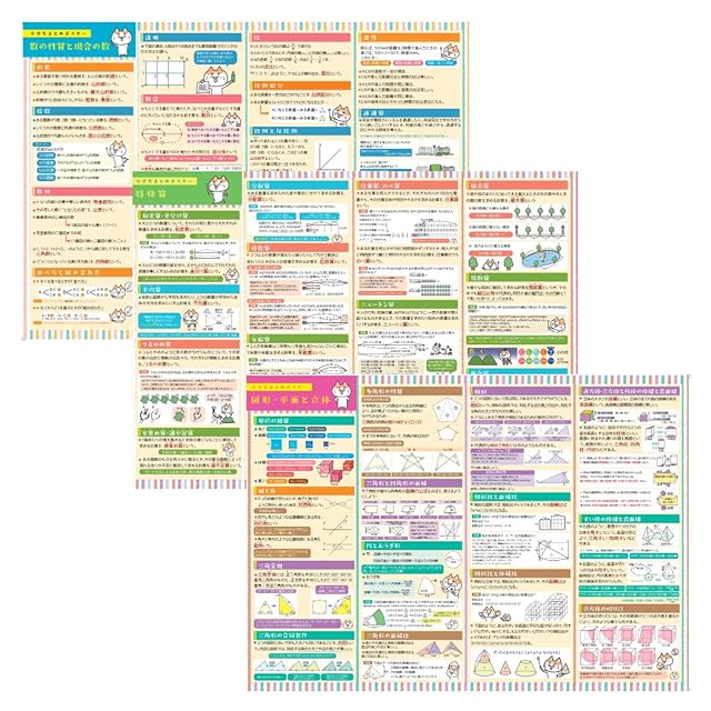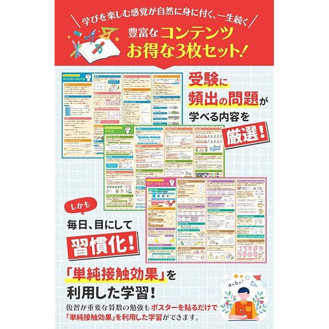 【お風呂で始まる中学受験対策】中学受験の算数に必要な情報を関連性のある単元ごとにまとめ、豊富な内容を整理しながら学ぶことができるポスターに仕上げました。3枚にすることで1枚ずつ区切りを付けながら学習することや、それぞれを別の場所に貼り「この内容はあの部屋で見た」というようにお子様が記憶を引き出す際に思い出しやすくする使い方も可能です。