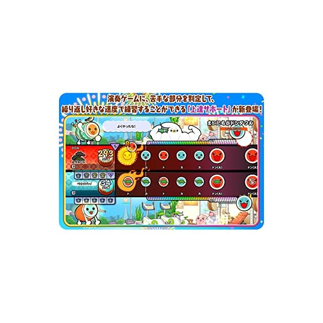 相棒のどんちゃん、オミコシティで出会ったくもきゅんと一緒に太鼓マスターを目指そう! 収録曲は「紅蓮華」「Feel Special」「夜に駆ける」など前作を超える76曲を収録! 苦手な部分を繰り返し練習してスキルアップできる「上達サポート」や、世界中のプレイヤーと演奏バトルを楽しめる「オンラインランクマッチ」! 他にも、おもちゃでデッキを組んで戦う「ドンカツおもちゃ大戦」、4人でライブの成功を目指す「どんちゃんバンド」などみんなで遊べる新モードも搭載!