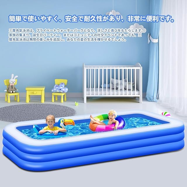 【安定感抜群の三気室仕様】このファミリープールは、三つの気室があり、短時間で簡単に空気を注入できます。空気の偏りが起きにくく、水を溜めても安定した設計となっています。排水ホースも付いており、面倒な排水もスムーズに行え、後片付けも楽々です!水を抜く穴が貫通していない場合は、小さな穴を開けても楽しく遊ぶことができます。このファミリープールで、安心して家族みんなで楽しい時間を過ごしましょう!