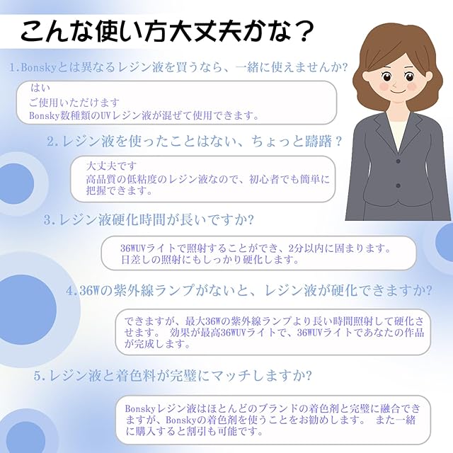 粘度が適当で使いやすい:UVレジン液の粘度が適当で、型に入れやすいです。お客様が好きな色とアクセサリーを自由に組み合わせることもできます。それらはうまく溶け込むことができます。使いやすいです!ボンスキーレジン液は泡立ちにくいです。完璧な小さな尖った口のデザインは手作りDIY愛好家とレジン工芸の初心者に便利です。
