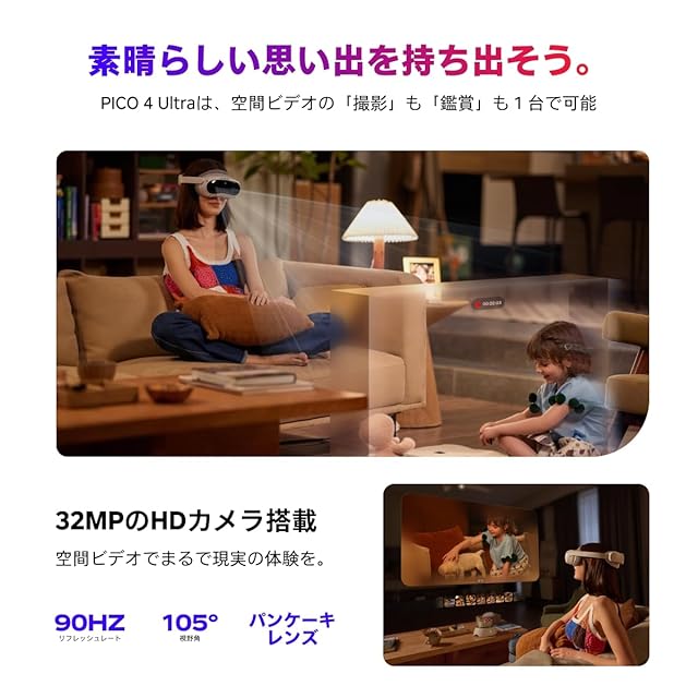 【思い出を立体的に残せる空間ビデオ】家族旅行や子どもの成長など、大切な瞬間を立体的に記録。従来の写真や動画とは比較にならない臨場感で、まるでタイムスリップしたかのように思い出を再体験できます。思い出の保存方法が、PICO 4 Ultraで一変します。