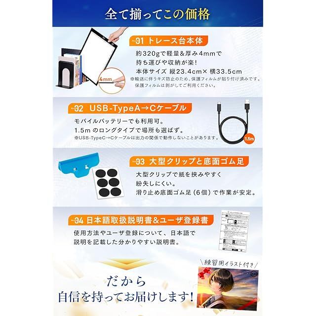 【多様な用途と付属品】1ミリ刻みの 目盛り 付で イラスト の正確な 模写 や線引き 漫画 のコマ割りに便利。 ダイヤモンドアート ライト にも使用できます。付属の1.5M USBケーブル と大型 クリップ で場所を選ばず トレス できます■本体は 厚さ 4mm の小型軽量でどこへでも持ち運び可能。学生や子供へのプレゼントにも可
