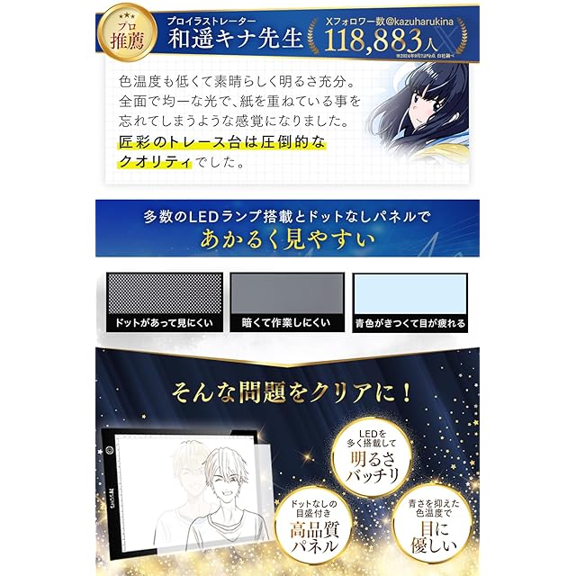 【プロ推薦の高品質モデル】 LEDライト を多く搭載し 高輝度 を実現。 ドットなしの 高品質パネル による全面発光で、均等な明るさとちらつきを軽減した快適な作業環境を提供します■ボタンの長押しで 無段階調整 ができ、タッチ感度も良好ですので ストレス なく調節できます。トレース用紙の厚さに応じて明度調整するのがおすすめです。