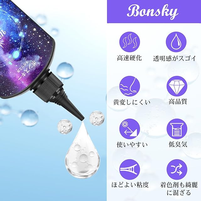 高い透明度と薄いにおい:(意匠登録1776576号、年間最もクリエイティブで人気のあるデザイン。)成形レジン液の透明度がとてもいいです!Bonsky(ボンスキー)レジン液は黄色くなりにくいです。透明パルプを合わせると、色がとても鮮やかです!良質で無害な材料で作られています。臭気が少なく、安全で環境にやさしいことに驚くでしょう。そして時間が経つにつれて簡単に黄色くなることはありません。