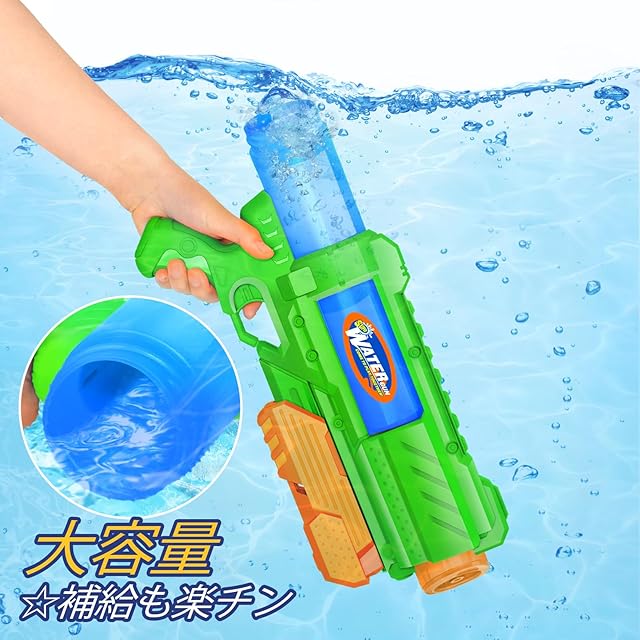 『☆補給が楽チン』水タンクは本体一体型で、給水口が大きいので素早い注水が可能です。プールなどに沈めて補給するのがおすすめです。大容量タンクなので、補給の回数も減らすことができ、水の残量を気にせず長時間の撃ち合いを楽しむことができますよ。
