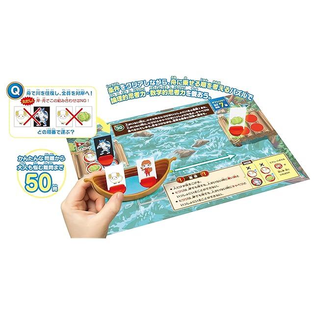 セット内容:舟×1台・舟シート×1枚・駒(小)×15個(人×3・人の子×1・ヒツジ×2・キャベツ×1・オオカミ×1・オオカミの子×1・ライオン×1×ライオンの子×1・トラ×1・トラの子×1・ドラゴン×1・ドラゴンの子×1) / 駒(台)ヒツジ姫×3) ※舟シート、駒に差し込むカードは台紙から取り外して使います) / 問題集×1部 / 解答集×1部