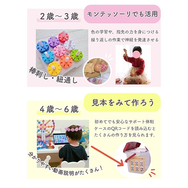 【年齢や成長に合わせた遊び方】2~3歳:色の概念や神経系の発達を促す遊び。4?5歳:平面的な作品で構成力を向上。6?7歳:立体的な作品で空間把握能力と想像力を伸ばす。8?12歳:グループワークでルールに沿った作品作りが楽しめます。お子様の年齢や成長に合わせた夢中になれる遊びが盛りだくさんです。