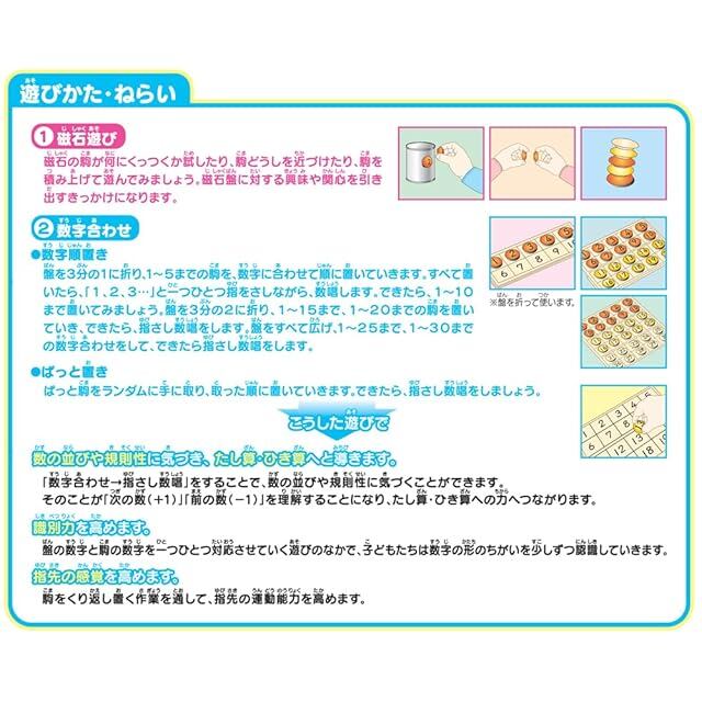 盤のうえに、磁石のコマを置いて30までの数字をおぼえます。盤の表は数字、裏は無地のマス目になっていおり、コマは1~10,11~20,21~30で、それぞれ色分けされています。