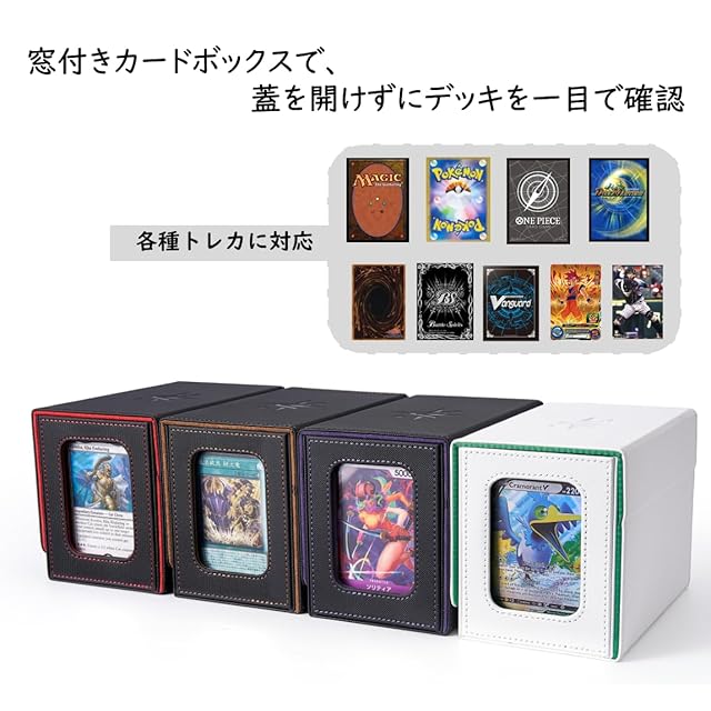 【デッキを迅速に識別できる革新的なデザイン】この カードケースの窓は統率者やエネルギーカードなどカードを安全に収納し、簡単に識別できるように誇らしげに展示します。このユニークな機能により、各カードボックスに収納されたデッキを迅速に識別できます。また、蓋を使って自立することができ、カードの入れ出しが更にスムーズになります。