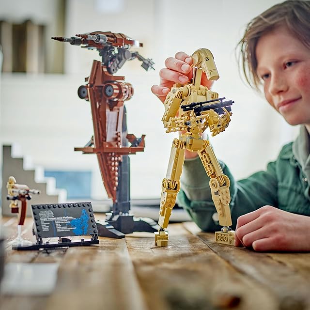 組み立てる可動フィギュア – 「バトル・ドロイド」のポーズを変え、ブロックで組み立てたブラスターを手に持たせたり背負わせたりできます