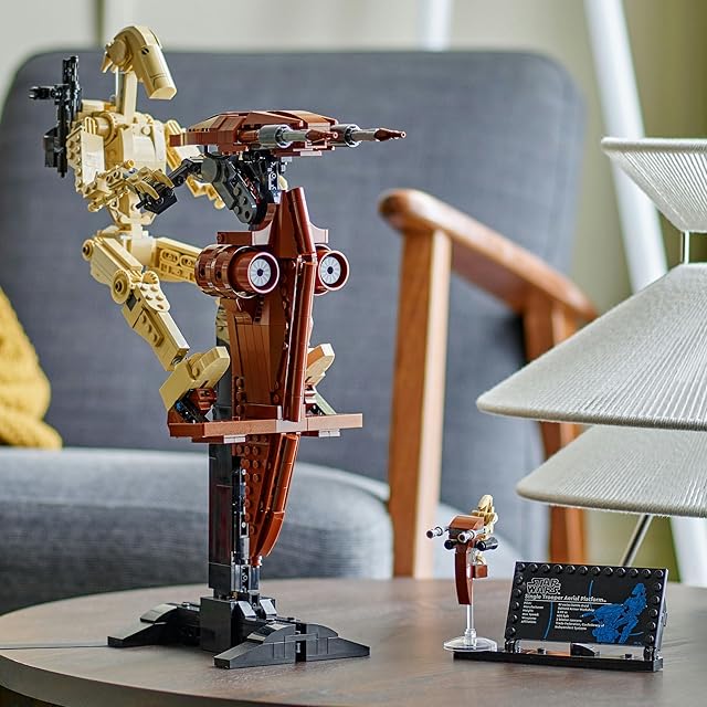 楽しいホームデコ – 情報プレートが組み込まれたディスプレイ用スタンドには、「バトル・ドロイド」のレゴフィギュアとSTAPスピーダーを取り付けるスペースがあります