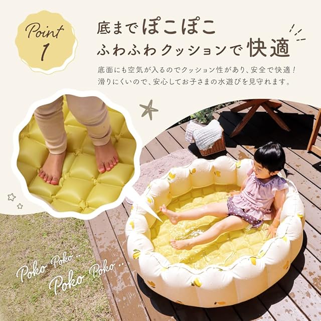【底までぽこぽこで痛くない】ぽこぽこプールは、底部にも空気が入るエアクッション仕様なので、底つき感を軽減し、固い地面の上でも痛みを感じにくいのが特徴!さらにこのぽこぽこが底滑りも軽減するので安心してお子さまの水遊びを見守ることができます。【排水口付きで排水らくらく】底部にはさらに排水口も付いているので、キャップを開けるだけでどんどんと排水していきます。やっかいなプールの排水も簡単です!